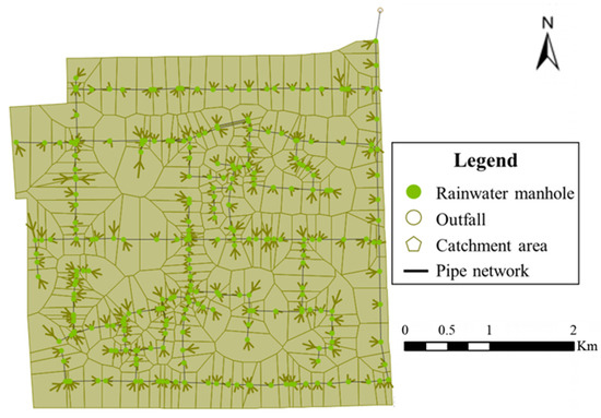 Pipes and manholes are the two primary components of the stormwater drainage network used to construct the runoff concentration model. Based on the characteristics of the drainage infrastructure and the available modeling data, the pipe network and stormwater inlets were schematized. In total, 266 orifices (inlets) and 270 pipe links were defined in the model. Each inlet collects surface runoff from its associated sub-catchment and conveys it into the pipe network through the corresponding manhole.