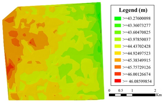 The 2D overland flow model calculates key parameters such as water depth, flow velocity, and inundation duration within each triangular mesh cell, providing a basis for urban flood risk assessment. This module accurately simulates the routing of surface runoff after stormwater overflows from manholes, enabling the prediction of flood velocity, flow direction, depth, and duration on the ground surface. Surface water movement is largely governed by terrain characteristics, making ground elevation data the most critical input for establishing the 2D overland flow model. Based on the provided elevation point dataset, a Triangulated Irregular Network (TIN) was constructed for the study area. The terrain data were derived from a DEM with a spatial resolution of 30 m (Figure 6), obtained from SRTM3. In addition, we clarified the pre-processing procedures applied to the DEM (e.g., hydrological correction and interpolation with local survey points) to ensure consistency with the drainage network and boundary conditions.