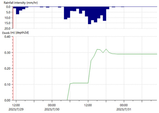 Based on the observed data at the waterlogging point, the simulated water level time series under the 7.29 rainfall event was extracted, as shown in Figure 10. The maximum water depth simulated by the model at this location was 0.32 m, while the observed maximum depth was 0.30 m, resulting in a relative error of 6.7%. Overall, the parameter settings yielded satisfactory results, indicating that the model is suitable for urban waterlogging simulation studies.
