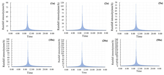 In this study, design rainfall hyetographs corresponding to return periods of 1, 2, 5, 10, 20, and 50 years were derived based on the local storm intensity formula [36]. A time interval of 5 min was used, with a total rainfall duration of 24 h and a peak coefficient of 0.4. The storm intensity formula is presented in Equation (2), and the resulting design rainfall hyetographs are shown in Figure 11.