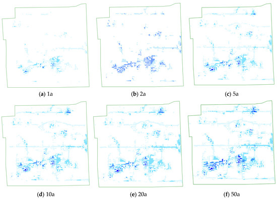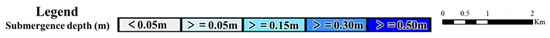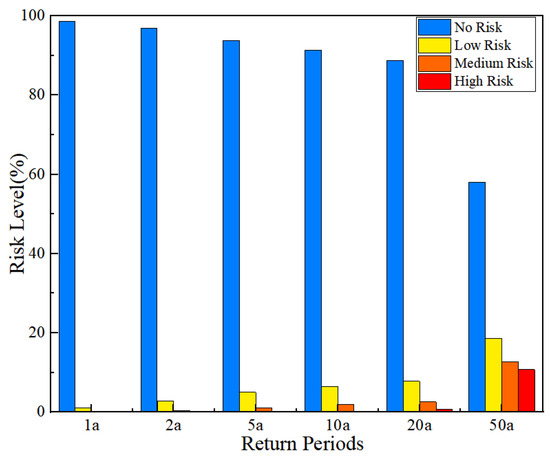 The classification of inundation risk levels is presented in Table 7. Detailed inundation simulation results under different return periods are shown in Figure 13 and Table 8 and Table 9.