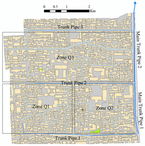 The drainage network was divided into eight functional zones: Trunk Line 1, Trunk Line 2, Main Line 1, Main Line 2, Main Line 3, Q1, Q2, and Q3 (see Figure 17). Six retrofitting scenarios were developed for these zones. The pipe lengths and corresponding estimated construction costs for each scenario are presented in Table 12. The upgraded pipe lengths for the six scenarios are 2315.9 m, 2315.9 m, 2686.7 m, 2907.1 m, 2649.2 m, and 2204.0 m, with estimated costs of 653,000 yuan, 714,000 yuan, 847,000 yuan, 927,000 yuan, 950,000 yuan, and 683,000 yuan, respectively.