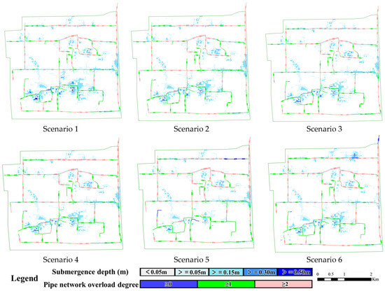 Scenario 1, representing the minimal intervention scheme, resulted in a maximum water depth of 0.50 m and an inundation area of 0.0155 km2, with high-risk zones still present—indicating limited mitigation effect. Scenarios 2 through 4 progressively expanded pipe diameters and upgrade areas, reducing maximum water depth to 0.46 m and stabilizing inundation area around 0.0129 km2. Although high-risk areas were eliminated, the marginal benefits of additional investment gradually diminished. Scenario 5 adopted large-diameter replacements for most trunk lines, achieving the most significant improvements: the maximum water depth dropped to 0.37 m, and the inundation area shrank to 0.0086 km2. It exhibited the smallest combined area of low- and medium-risk zones and completely eliminated high-risk zones, demonstrating the best overall control performance. Scenario 6 introduced new pipe segments and optimized layout under cost constraints, achieving favorable outcomes with a maximum water depth of 0.45 m and an inundation area of 0.0118 km2—better than Scenarios 2 and 3, but slightly less effective than Scenario 5.