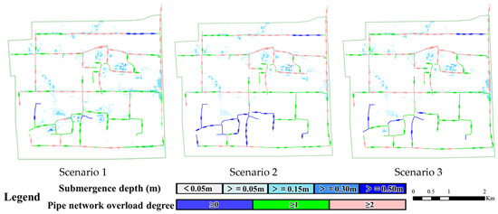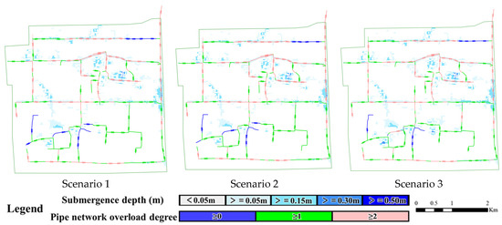 Overall, Scenario 1 stands out as an effective integration of green infrastructure and traditional grey engineering. It significantly reduces flood risk while keeping costs under control. Scenario 2, despite higher input, exhibits diminishing marginal returns and lower cost-efficiency. Scenario 3, although more economical, shows a marked decline in mitigation performance. Therefore, Scenario 1 is recommended as the optimal integrated mitigation scheme, balancing hydraulic performance and economic viability, and providing a practical solution for flood control in aging urban districts.