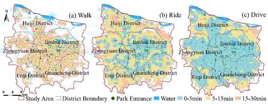 The spatial distribution of parks in Zhengzhou is mostly closely adjacent to water bodies, primarily along the Yellow River, Jialu River, and the main river basins in the urban area. According to the service range of the park under different time thresholds and various travel modes (Figure 2), it can be seen that the overall reachable range of the study area under the walking mode is limited. The space is concentrated in the southwest of Jinshui District, the southeast of Huiji District, the eastern part of Zhongyuan District, the northwest of Guancheng District, and the northeast of Erqi District, while peripheral villages and suburbs are relatively weak due to sparse population and lack of geographical advantages of the park layout.