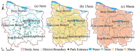 Under the integrated transportation mode, park service areas at different time thresholds demonstrate distinct gradient coverage characteristics. The 5 min service area primarily covers the core zones surrounding the parks, with a coverage area of 112.96 km2, accounting for only 10.93% of the total study area. Its limited scope mainly fulfills the immediate needs of residents in proximity to the parks (Figure 3a). As the time threshold increases, the 15 min service area exhibits significantly enhanced connectivity, covering 5619.41 km2 (Note: this value exceeds the total study area due to overlapping service ranges of individual parks). This 15 min service area substantially meets the demand for most residents within the study area to reach a park within 15 min (Figure 3b). Further expanding to the 30 min threshold achieves near-complete coverage of the study area, with a coverage area of 40,095.08 km2. This remarkable improvement effectively enhances park accessibility for residents within an acceptable time frame, fully demonstrating the supporting role of integrated transportation modes in the efficiency of public service coverage (Figure 3c).