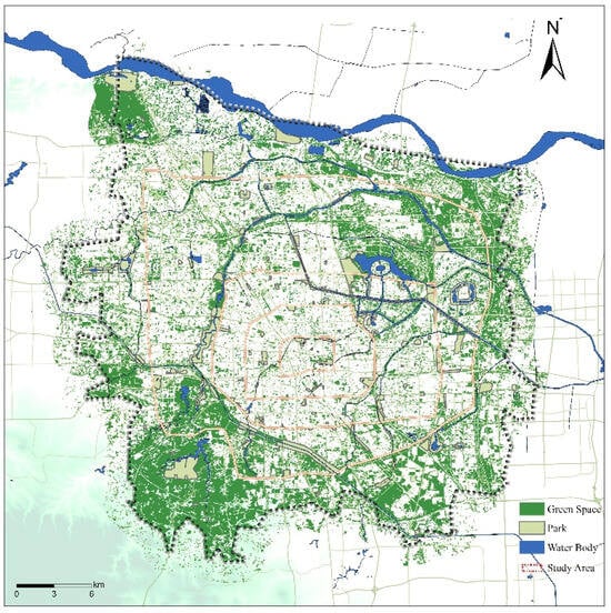 Zhengzhou is the capital of Henan province and the national central city in China. The built-up area of its central urban area reached 822.30 square kilometers in 2024. This area covers core segments including Zhongyuan District, Erqi District, Jinshui District, Guancheng Hui District, Huiji District, Zhengdong New District, Zhengzhou Economic and Technological Development Zone, Zhengzhou High-Tech Industrial Development Zone, and Zhengzhou Airport Economy Zone, which together constitute a key part of the main urban area. According to data from the Zhengzhou Municipal Bureau of Statistics, as of 2025, the permanent population of Zhengzhou was 13.008 million, with an urbanization rate of 81%, placing it among China’s super-large cities. The population exhibits a typical spatial gradient of “high-core, low-suburban” distribution, with the urban form undergoing a critical transition from a “single-center” to a “multi-center, cluster-based” structure. In response to the national “Park City” strategy, the city has opened a total of 267 shared green spaces with a total area exceeding 9.22 million square meters. These green spaces are widely distributed in parks, squares, corridors, and other regions, with a higher density in the main urban area, providing basic space for residents’ leisure, recreation, sports, and fitness activities [42]. However, amid rapid urbanization, Zhengzhou faces structural imbalances in park supply and demand similar to those of other super-large cities nationwide: “sufficient overall scale but mismatched tiered structures and spatial layouts” [43].