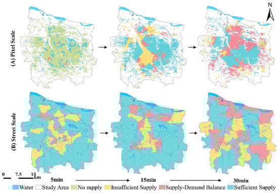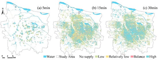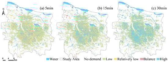 There are significant spatial differences between the supply of park services and the demand from residents (Figure 5 and Figure 6). In the 5 min service area, the area where the park supply area is insufficient to meet the needs of residents accounts for the vast majority, and the overall accessibility of the park is low. The number of pixels with supply and demand balance or better is 25,596, accounting for only 14.68% of the total number of pixels containing the population. Pixels with a high supply–demand ratio (value ≥ 1.2) are mainly concentrated in the adjacent areas around the parks. When the time threshold is extended to 15 min, the number of pixels with supply and demand balance or better increases significantly to 125,063, accounting for 71.74%. The area meeting demand expands, with high-value areas concentrated around large parks such as the National Forest Park, Dongfengqu Riverside Park, Longzi Lake Park, and South-to-North Water Diversion Park. In the 30 min service area, more than half of the population-containing pixel points can obtain park services that meet the demand, and the number of pixels with supply and demand balance or better has further increased to 150,514, accounting for 86.34%.