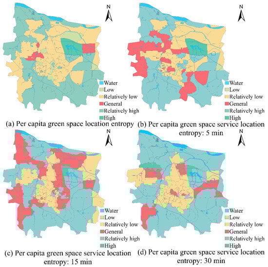 The location entropy can be used to measure the spatial distribution characteristics of the elements in a specific region and reflect the difference between the development degree of the elements in the area and the overall region. Among them, the per capita green space location entropy represents the level of residents’ per capita access to park space resources (Formula (5)), while the per capita green space service location entropy reflects the level of per capita access to effective services in park space (Formula (6)). Together, they characterize the spatial matching of park resources and the resident population.