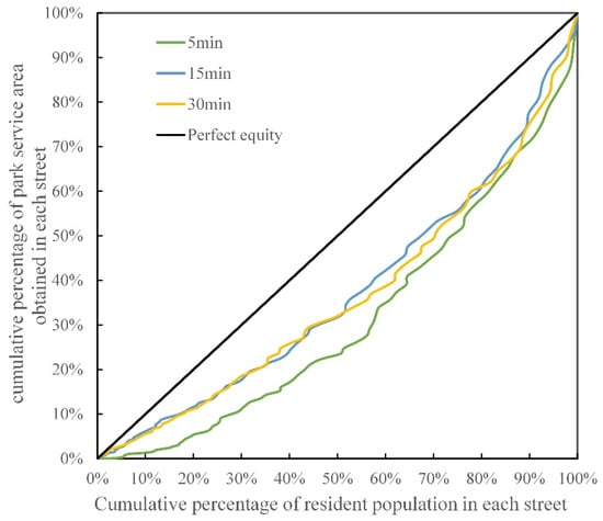 To more intuitively reveal the equality of residents’ access to park resources, this study takes the cumulative percentage of resident population in each street as the horizontal axis and the cumulative percentage of park service area obtained in each street as the vertical axis to draw the Lorenz curve (Figure 9). The analysis shows that the Lorentz curve under the 15 min time threshold is closest to the absolute equality line, indicating that the supply and demand matching of the park space is relatively balanced within this time range. The Lorentz curve for the 5 min time threshold is far away from the absolute equity line. Its distribution characteristics show that the streets accounting for 40.00% of the population only cover about 10.00% of the park space resources, and the roads accounting for 65.00% of the population enjoy about 25.00% of the park resources, indicating that a small number of people concentrate most of the green space resources.
