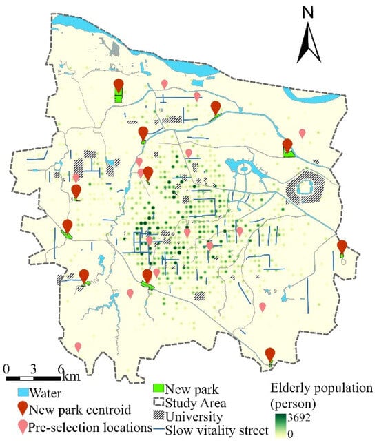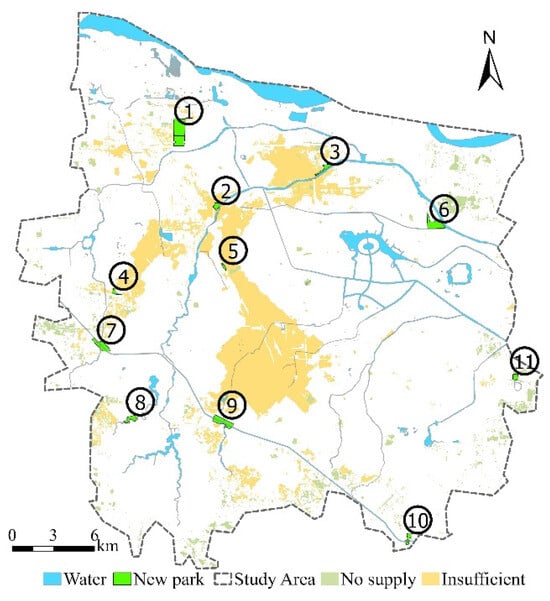 Based on the preliminary results, land-use data, education facilities, green space, the elderly population grid, building POI, land planning, and other factors were comprehensively integrated to optimize the adjustment. This was to ensure that the final site selection scheme could effectively meet the needs of residents and can be coordinated with urban land-use planning to maximize the ecological and social value of the park. According to the “Guidelines for the Implementation of Overall Urban Design in Zhengzhou City” issued by the Natural Resources and Planning Bureau of Zhengzhou City in June 2024, “the new planning community park green space, community service, leisure business and other facilities are given priority in the street layout”; thus, the location information of 80 chronic vitality streets was extracted to further guide the formulation of park layout optimization strategies and provide scientific reference for future planning and construction. Based on the above influencing factors, 11 park sites were finally selected, and satellite images and field surveys were combined to draw the boundaries of new parks (Figure 10). The specific park location is presented in the Appendix A. Finally, based on the resident need survey data (Table 7), a human-centered quality improvement strategy was implemented to promote the coordinated development of park scale supply and service optimization with the aim of building a full-age-friendly and fair urban park service system.