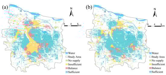 Comparison of the supply and demand ratio before (a) and after (b) the addition of new parks.