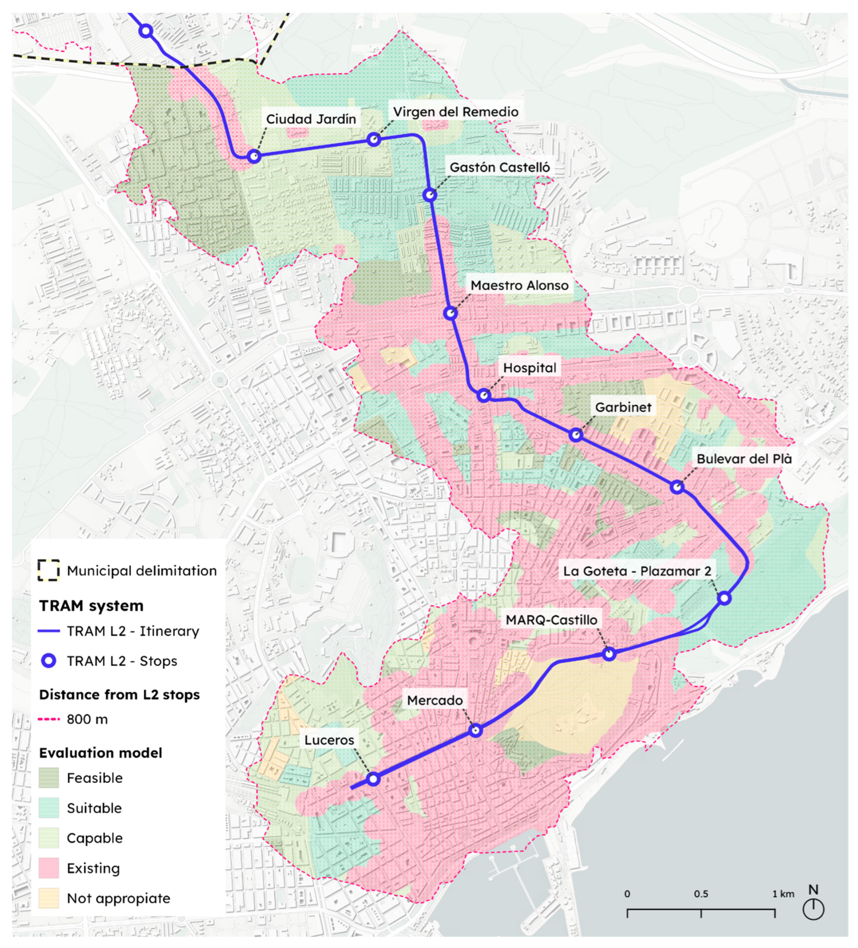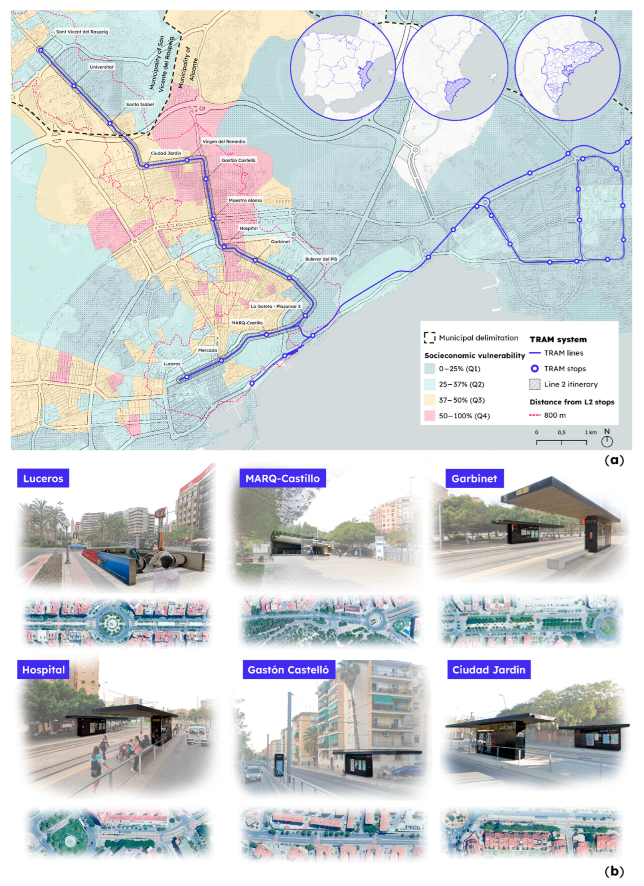 - Bosch-Checa, C.; Lorenzo-Sáez, E.; Haza, M.J.P.d.L.; Lerma-Arce, V.; Coll-Aliaga, E. Evaluation of the Accessibility to Urban Mobility Services with High Spatial Resolution—Case Study: Valencia (Spain). Appl. Sci. 2025, 15, 1382. [Google Scholar] [CrossRef]