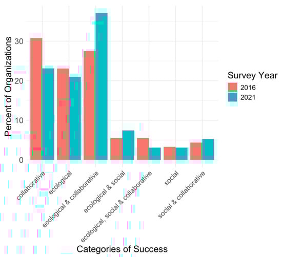 Measuring success and efficacy at the landscape-scale can be particularly challenging for conservation initiatives due to the long temporal scales often needed to establish and sustain projects and the complexity of spatial scales, jurisdictions, and governance layers [37]. While our findings indicated that LCIs often focused on wildlife habitat and watershed protection, the perceived biggest successes of the LCIs were most often categorized as distinctly Collaboration or as a combination of both Collaboration/Ecological in both 2016 and 2021. Collaboration included many examples of developing plans and identifying priorities, forming and strengthening partnerships through formal and informal means, and gaining investment through grants and donors that sustain initiatives over time. For both years, only the Ecological metrics of success ranked third. While some of the Ecological successes were focused on restoration of habitats, others were related to protecting the land through acquisition and easements or policies that protected specific land and water areas or species. Data collection and synthesis were focused on ecological data for science, inventory, and monitoring purposes. It is important to note the presence of combinations of different categories in the responses, indicating that there is a recognition of the diverse and intangible forms of success beyond just ecological metrics.