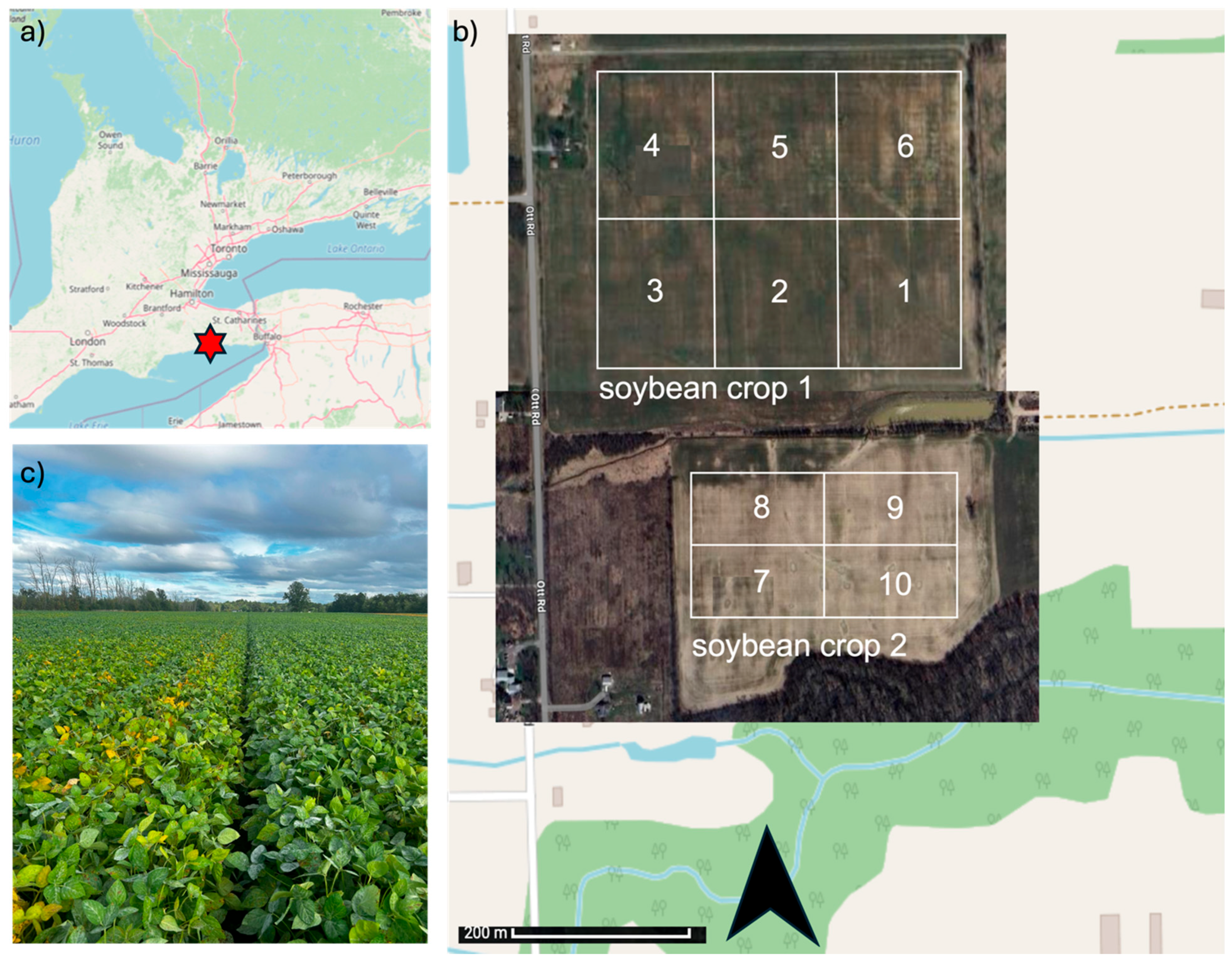 The site comprises two adjacent soyabean agricultural fields designated as Farm 1 (location 1) and Farm 1 (location 2), each hosting six and four experimental plots (1–6 and 7–10, respectively). The soil used for this study was collected from May to October 2024 at a depth of 20 cm. Prior to sampling, the entire area received an application of regular crushed wollastonite (30 μm) at a rate of 2.908 metric tons per acre (7.186 tonnes/ha) on 29 April 2024, as part of an enhanced weathering strategy aimed at increasing soil inorganic carbon through silicate mineral amendment. Following application, the wollastonite was incorporated into the topsoil to a depth of approximately 0–20 cm using a disk plow, consistent with common liming practices in Ontario, to ensure effective contact between the mineral particles and the soil matrix.
