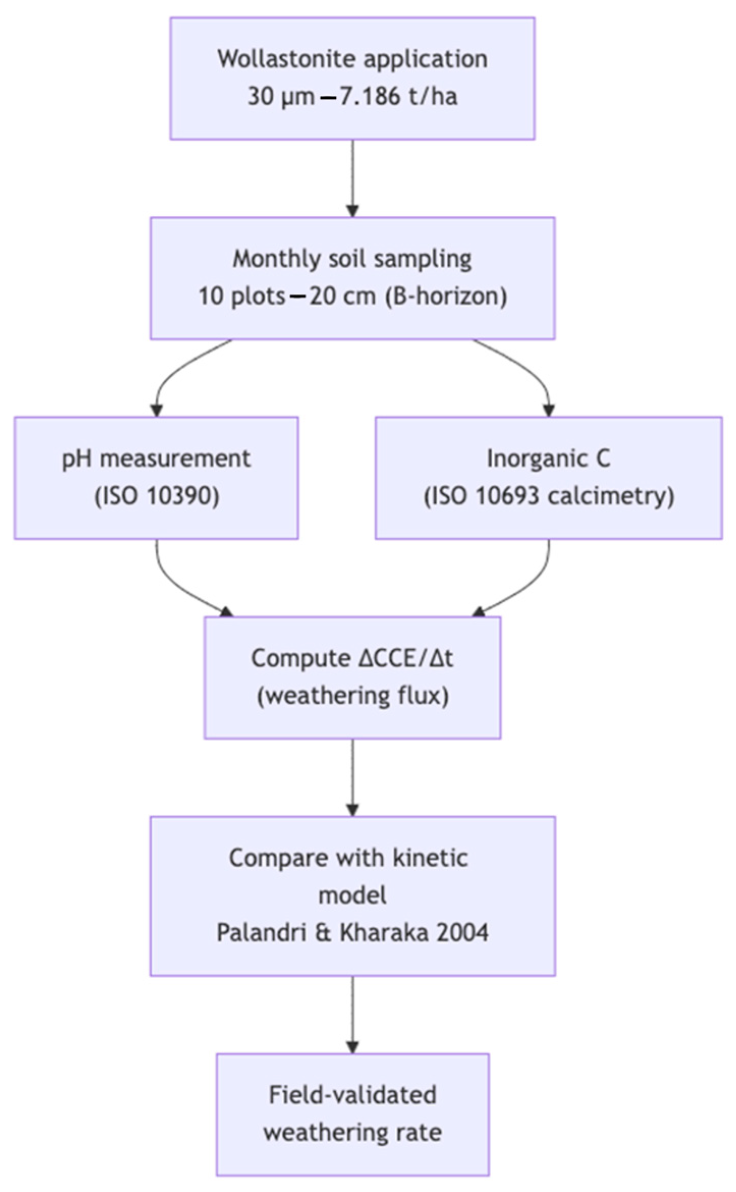 Note on weathering flux calculation: The empirical weathering rate in mol m−2 s−1 was estimated using Equation (5), where SSA = specific surface area of wollastonite = 0.01146 m2/g; Mass ₍wollastonite₎ = applied mass per area = 718 g/m2; ρ₍soil₎ = soil bulk density = 1500 kg/m3; Depth = soil sampling depth = 0.2 m, M ₍wollastonite₎ = molar mass of wollastonite = 116.15 g/mol; Δ[CaCO3]/Δt = calcimetry-based carbonate accumulation rate in g/kg/s.
