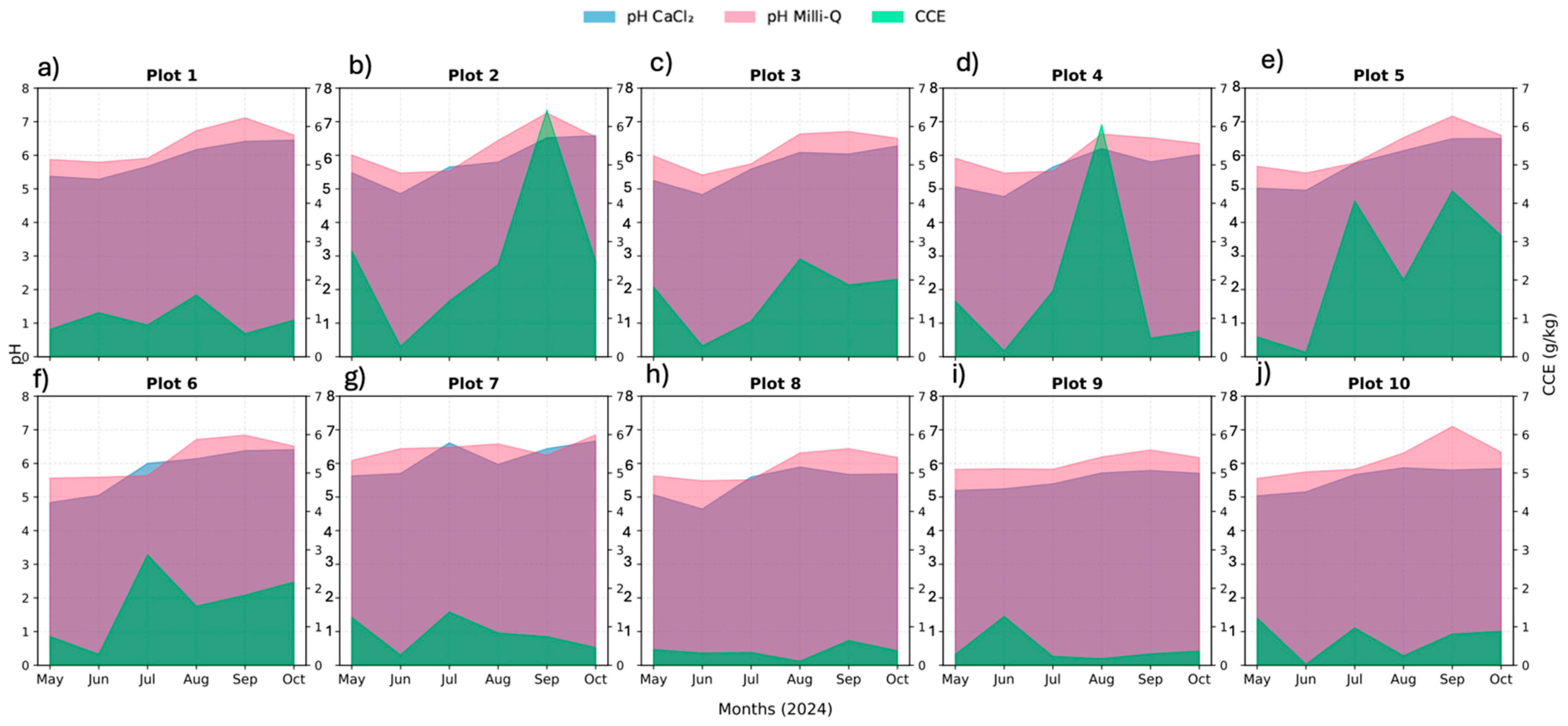 The peak in September, especially prominent in the Milli-Q dataset, captures the highest pH values and the greatest variability, marking a dynamic phase in the system’s evolution. By October, a slight decline or stabilization in pH point it out the onset of a new equilibrium or a seasonal transition, as external drivers like temperature and biological activity begin to shift. Overall, the results reflect a soil system that evolves gradually under mineral amendment but becomes increasingly complex over time. This underscores the need for ongoing monitoring to better understand the temporal dynamics of alkalinity development and their potential agronomic or environmental implications.