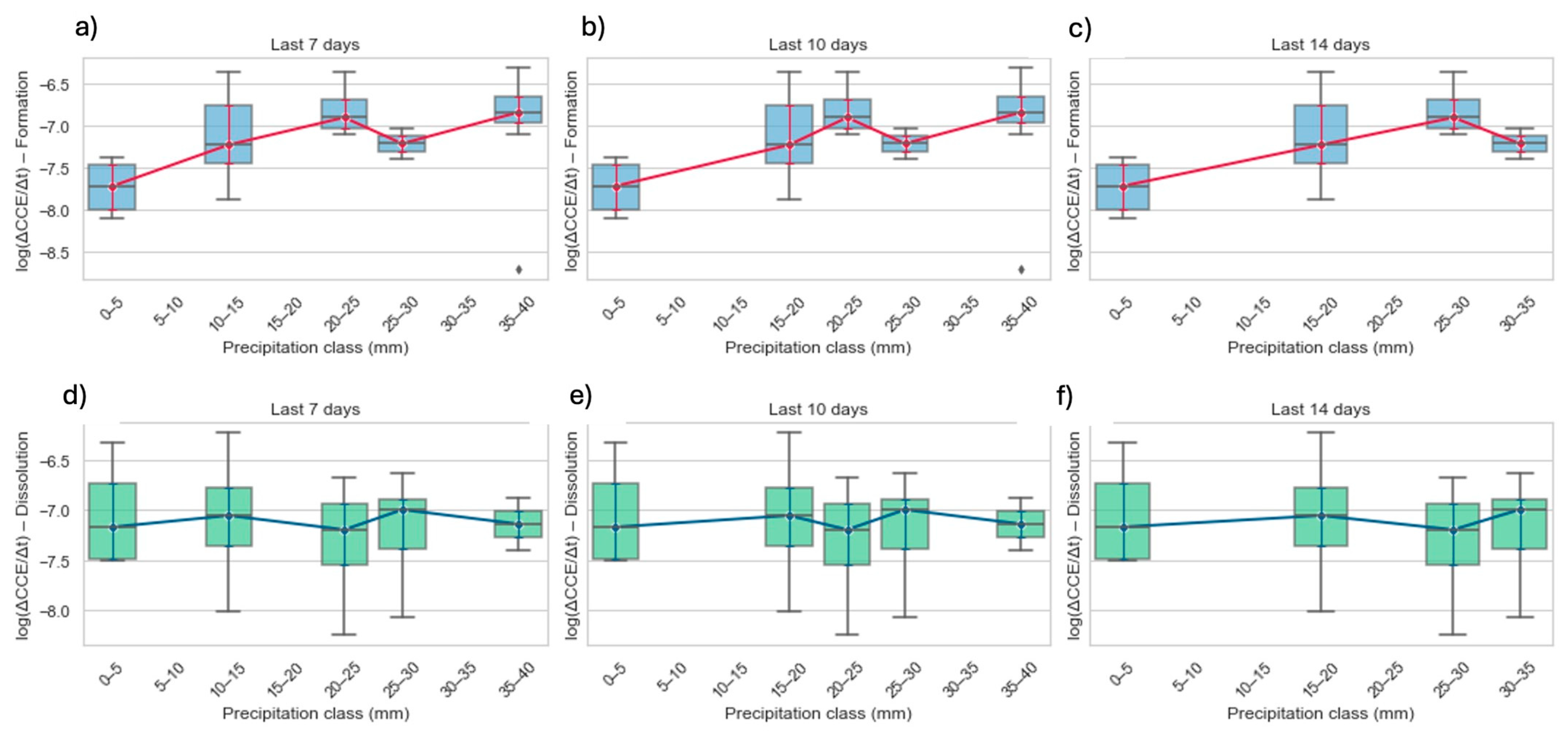 Figure 7a–c, the red-median trend line climbs steadily from the driest bin (0–5 mm) to intermediate rain classes (≈25–30 mm), showing that carbonate-formation flux increases as short-term rainfall rises. The effect is clearest in the 7- and 10-day windows, where the median flux strengthens by ~0.6 log units between the lowest and mid-rain bins. Beyond ~30 mm the curve flattens, indicating that once a threshold of soil moisture is reached additional rainfall adds little further benefit, perhaps because pores become saturated and diffusion-limited, or because leaching starts to remove Ca