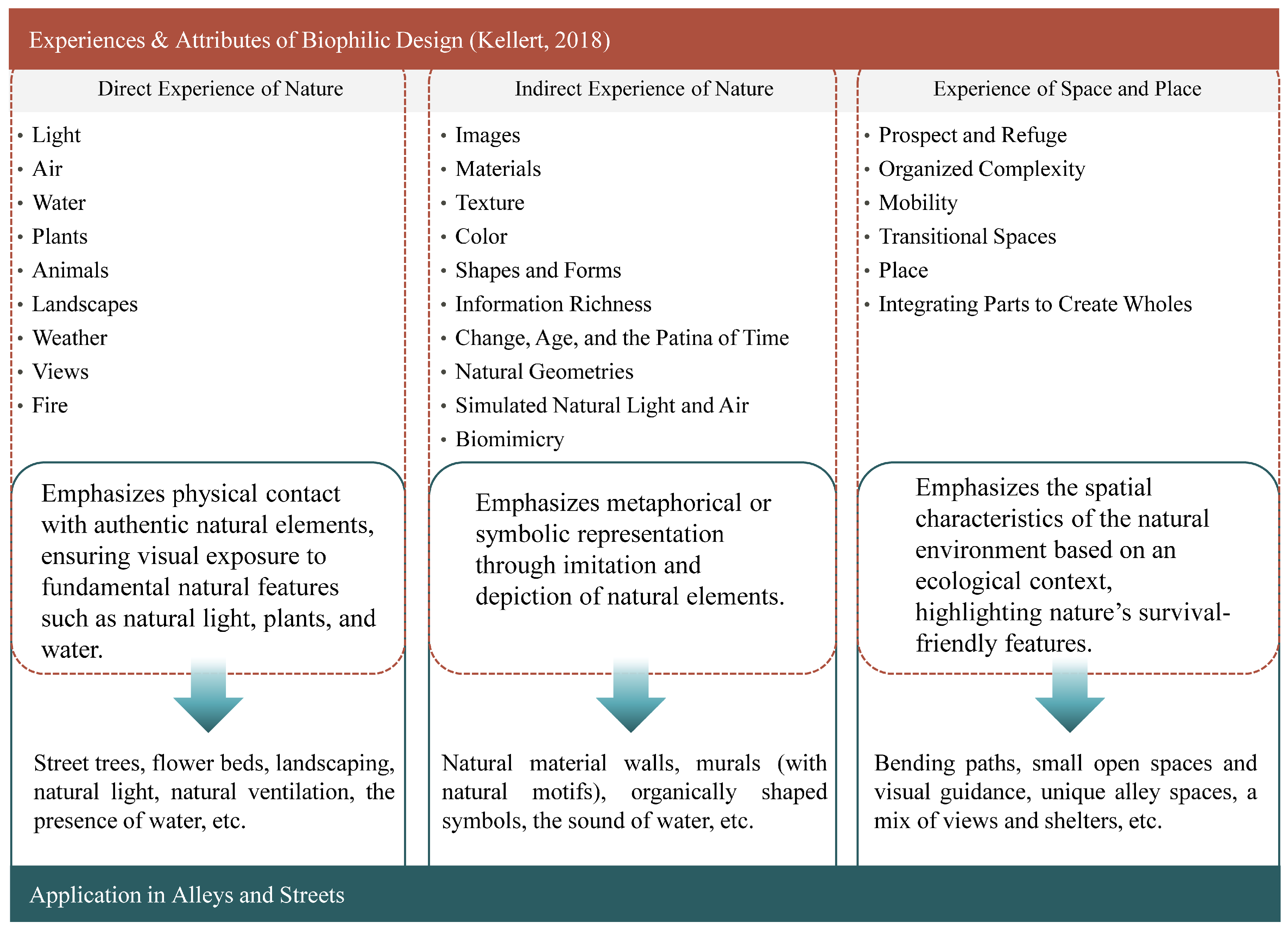 | Edge | Attributes: Texture, transitional spaces, and plants Strategy: Emphasize wall texture variation; integrate vines and transitional vegetation [9,15] | Attributes: Light, change & age, the patina of time, and images Strategy: Use contrasts of light and shadow; install green walls and climbing plants; emphasize central historic symbols and aged materials [8,15] | Attributes: Plants, animals, natural geometries, shapes and forms, and place Strategy: Provide habitats and linkages for small species while maintaining physical boundaries; integrate wall/floor and biophilic shapes and patterns [35,37] | Highlight perceptual distinctiveness of spatial transitions; create soft boundary shifts between enclosed and open areas; strengthen ecological diversity and continuity [9,38,39] |