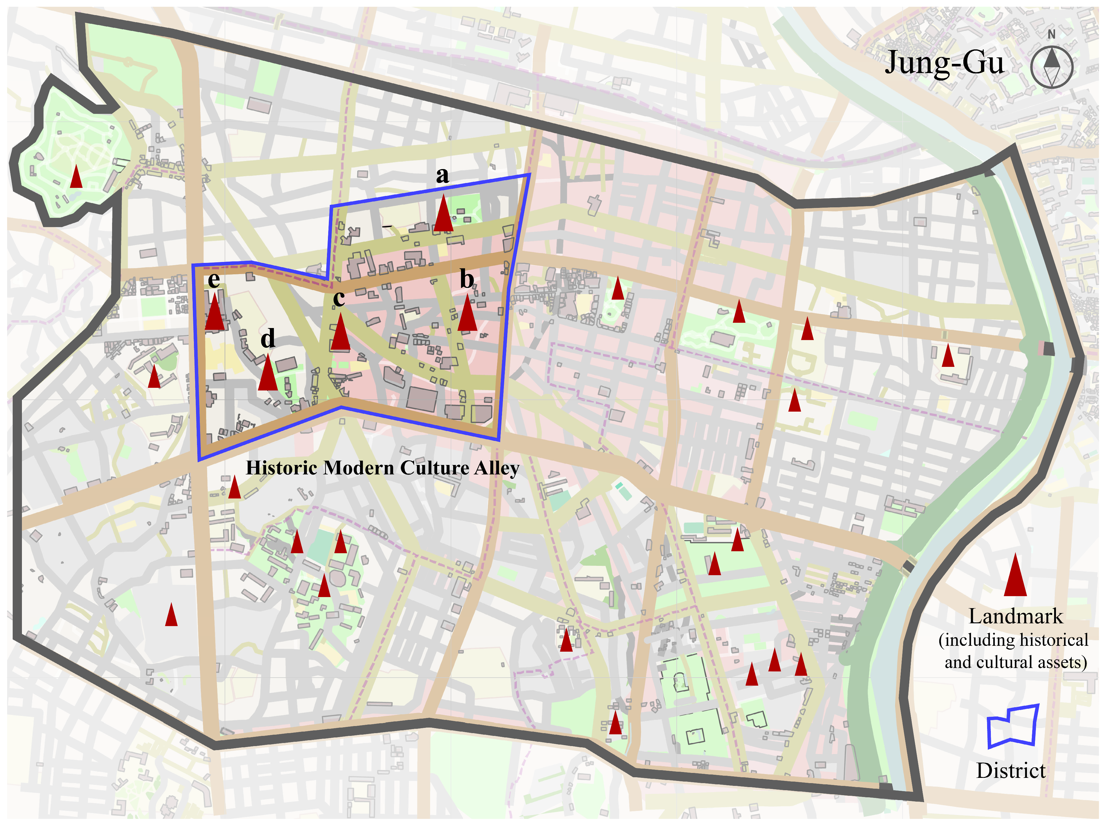 - Yu, H. A Study on Urban Regeneration and Creating Place Assets in Daegu Modern Alleyway. Ph.D. Thesis, Kyungpook National University, Daegu, Republic of Korea, 2019. [Google Scholar]