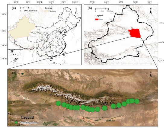 Turpan Region and Sampling Sites. (a) China and Xinjiang. (b) Turpan. (c) Sampling points.