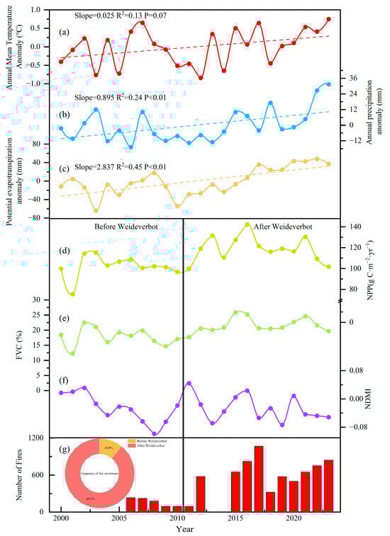Changes in Climate, Vegetation, and Fire in the Turpan Region, China, 2000–2023. (a) Anomaly changes in annual average temperature; (b) anomaly changes in annual precipitation; (c) anomaly changes in potential evapotranspiration; (d) interannual variations in vegetation net primary productivity (NPP); (e) interannual variations in fractional vegetation cover; (f) interannual variations in vegetation water content (NDMI); (g) interannual variations in fire frequency in the Turpan Region.