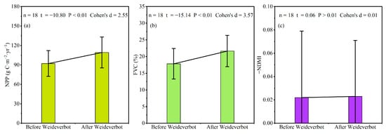 Changes in vegetation before and after weideverbot in Turpan region, China: (a) vegetation net primary productivity (NPP); (b) fractional vegetation cover (FVC); (c) vegetation water content, represented by the negative value of NDMI.