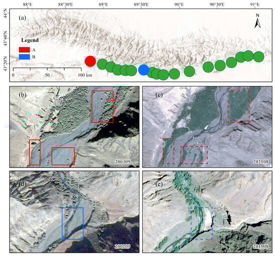 Historical satellite imagery (Google Earth Pro) comparing vegetation changes at two representative sample sites (A and B) in the Turpan region before and after weideverbot, showing increased vegetation cover and fuel accumulation in the post-prohibition period (acquisition dates noted in the bottom right corner of each panel). Green dots indicate the locations of other sampling sites for regional context. Solid and dashed rectangles delineate the areas before and after weideverbot, respectively. (a): location of A and B; (b,c): before and after weideverbot of site A; (d,e): before and after weideverbot of site B.