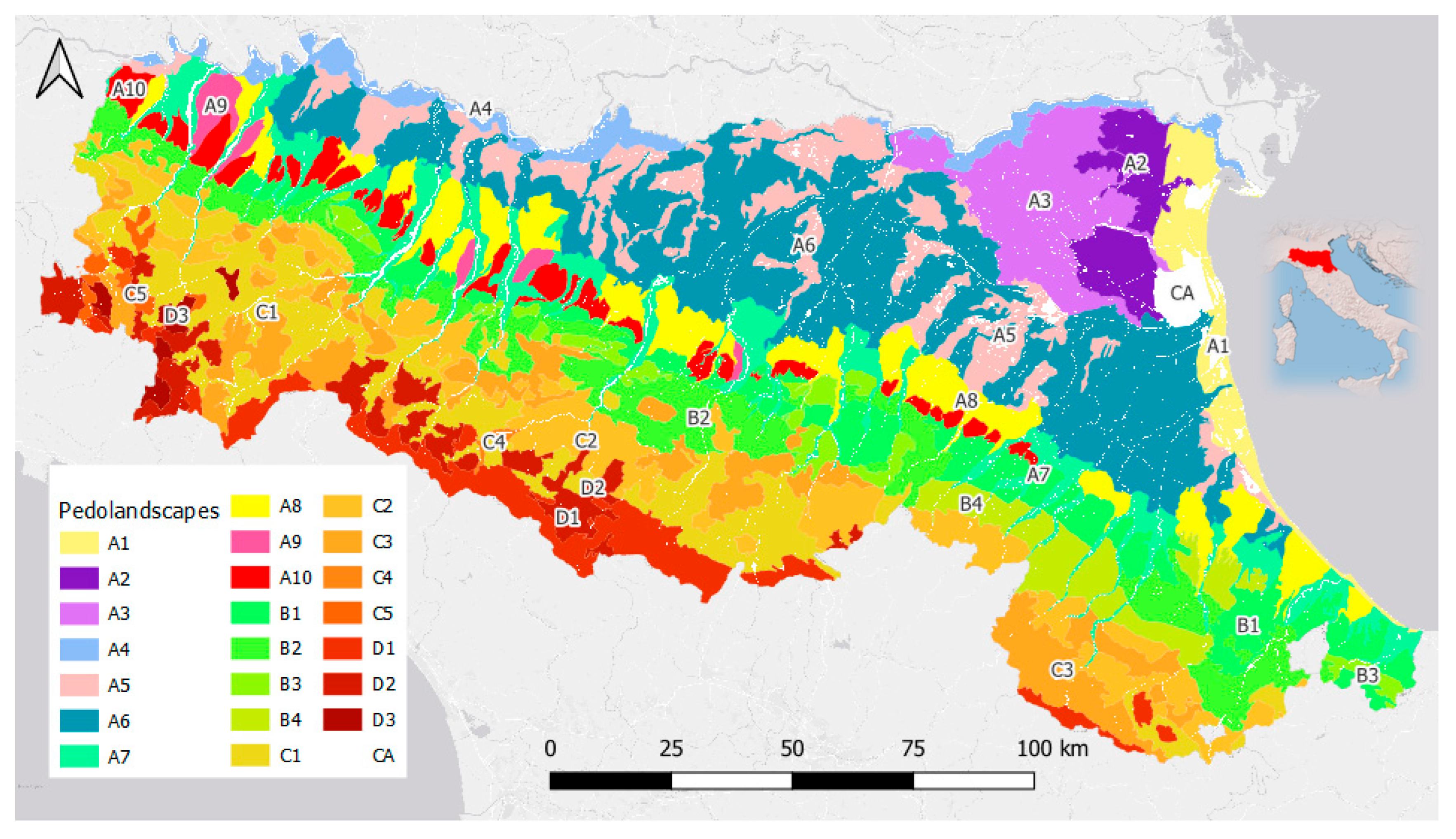 - Regione Emilia-Romagna. Carta dei Suoli Della Regione Emilia-Romagna in Scala 1: 50.000. Edizione 2021. Available online: https://geo.regione.emilia-romagna.it/gstatico/documenti/dati_pedol/carta_suoli_50k.pdf (accessed on 10 July 2025).