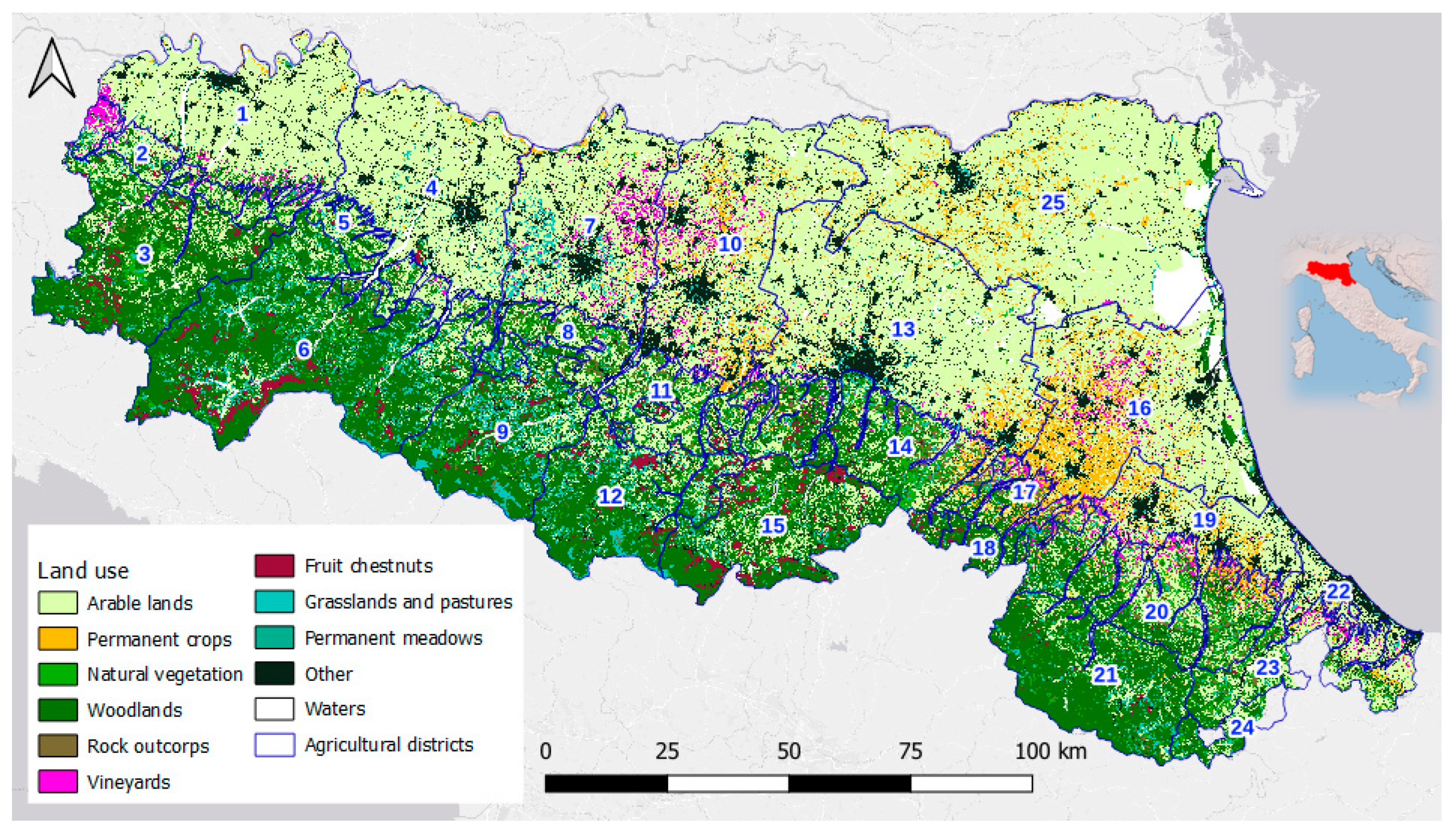 - Garberi, M.L.; Lenzi, D.; Mariani, M.C.; Masi, S.; Orlandi, F.; Vigilante, E. Database Uso del Suolo di Dettaglio 2017–Documentazione Regione Emilia-Romagna, Servizio Statistica e Sistemi Informativi Geografici, 2020. Available online: https://geoportale.regione.emilia-romagna.it/approfondimenti/contenuti-allegati/documentazione-uso-del-suolo/capitolato-tecnico-uso-suolo-dettaglio-2017-ed-2021.pdf (accessed on 10 July 2025).