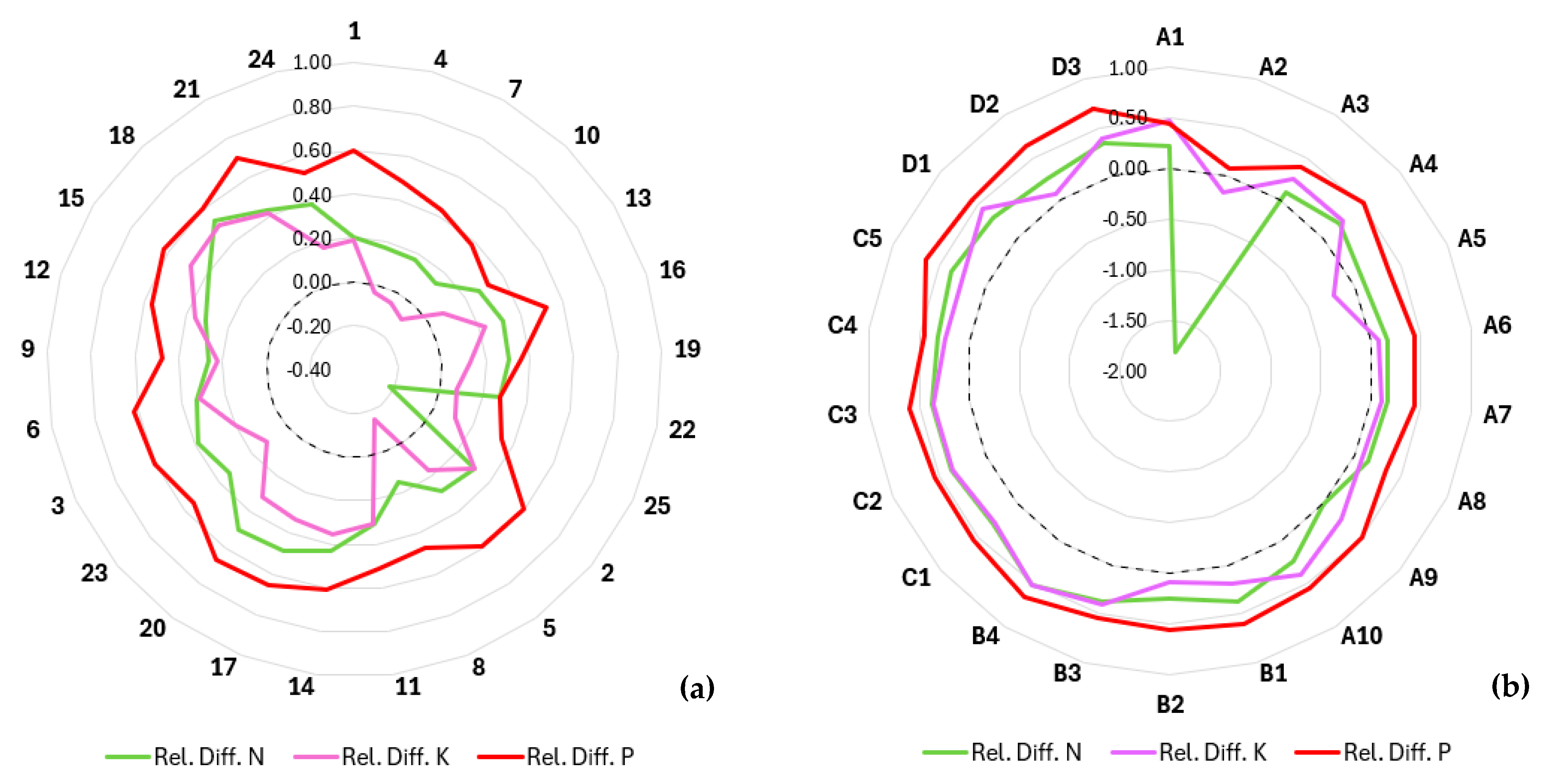 - Sampling density: the fundamental difference in observation density, LUCAS (~1.5 sample/200 km2) versus RER (~1.6 samples/km2), is the most critical factor. The RER dataset’s high density allows it to capture local variability and nutrient cold spots and hotspots that are statistically invisible at the LUCAS sampling density. It is noteworthy that recent research highlighted that for most soil properties, macronutrients included, the differences in survey design and sampling protocols between LUCAS and Italian methods did not lead to significant differences, showing consistency among the different sampling procedures [57].
