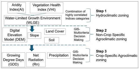 The proposed methodology consists of three stages (steps): (a) Hydroclimatic zoning. The first step considers water adequacy by analyzing the relationship between vegetation health (vegetation health index-VHI) and climate conditions (aridity index-AI), which collectively determine WLGE zones. (b) Non-crop-specific agroclimatic zoning. The second step evaluates the suitability of natural resources for agricultural use. Soil types, land use—land cover features, altitude, slope and water availability are assessed to create general agricultural suitability zones. (c) Crop-specific agroclimatic zoning. The final step determines optimal agricultural zones for specific crops based on agricultural and agrometeorological parameters, such as growing degree days (GDD), net radiation (Rn), and spring precipitation. As a final product, productivity agroclimatic zoning is produced, combining the suitability of the regions studied for general agricultural production and the indicators obtained for the different crops separately.