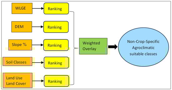 With regard to the construction of the GIS multi-criteria model, a geospatial database is created using GIS software (ArcGIS 10.8). The ranking and derived weights (from AHP methodology) of the criteria (WLGE, soil types, DEM, slopes, and land use/land cover) are incorporated into the model (Figure 2). Finally, the weighted overlay approach is implemented to derive the five non-crop-specific agroclimatic suitable classes: highly suitable, fair suitable, moderate suitable, marginally suitable, not suitable.