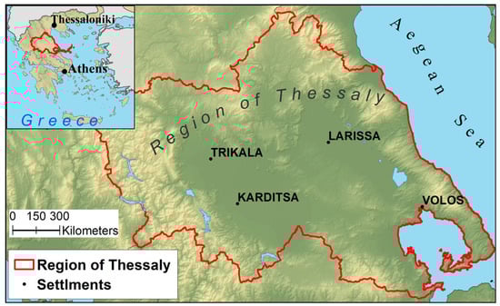 The Thessaly region is situated in central Greece (Figure 3), occupying approximately 13,700 Km2 (continental part of the region). The agricultural plain is in the center, covering about 50% of the region, whereas the rest consists of mountainous and semi-mountainous areas.