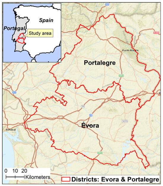 The study region, located in Southern Portugal, comprises the districts of Évora and Portalegre, which correspond to the NUT III regions of Central Alentejo and Upper Alentejo, respectively (Figure 4).