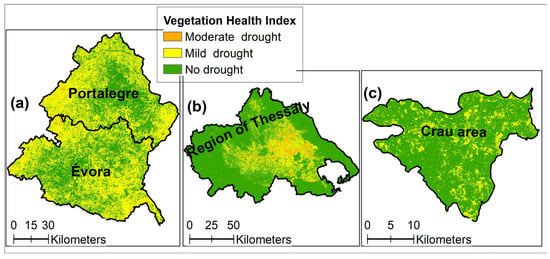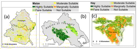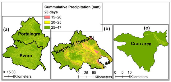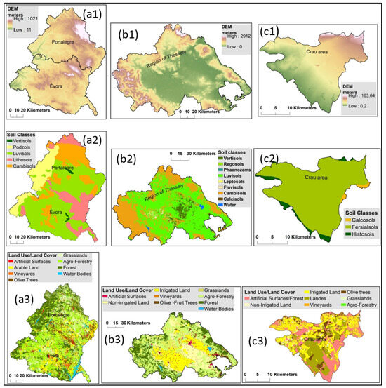 The implementation of the proposed methodology is conducted across three study areas, which exhibit diverse climatic conditions, topographic features, and agriculture systems. These three study areas are (a) Regions Évora-Portalegre in Portugal, (b) Region of Thessaly in Greece, and (c) Area of Crau in France (see Section 3 for description).