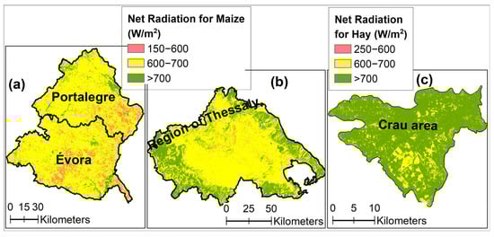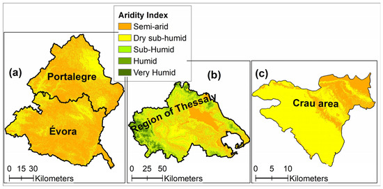 For the implementation of the above presented methodology, three study areas in southern Europe are considered: (a) the Thessaly region, Greece, (b) the Évora and Portalegre regions, South Portugal, and (c) the Crau region, South France. These areas are characterized by semi-arid to sub-humid climate with industrialized agriculture.