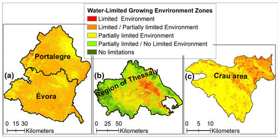 The WLGE zones are calculated by combining both VHI and AI indices. These WLGE zones, are categorized into five classes (Table 3): no limitations, partially limited/no limitations environment, partially limited environment, limited/partially limited environment, and limited environment [18]. WLGE zones represent microclimatic features of the available water resources, which are very significant for vulnerable agroecosystems, such as the Mediterranean region.