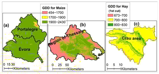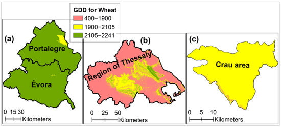 For each study area, the heat accumulation (GDD) is calculated over the basic crops. During the crop lifetime (e.g., November–June) the degree-day sum per pixel per year is estimated; then, the final product is the median value of the annual GDD for a period of more than twenty years (2001–2022).