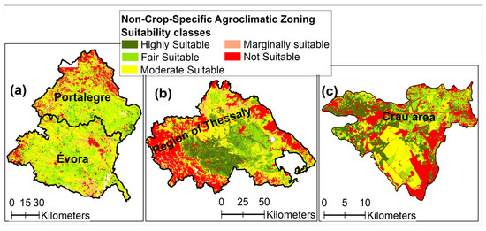 Recently, the FAO (Food and Agriculture Organization) of the United Nations (UN) conducted emblematic research and developed Agro-Ecological Zones (AEZ) to support sustainable agriculture at different scales including modeling at different scales, medium-scale zones, national-scale, and regional-scale zones, leading agricultural systems to be more productive and less vulnerable [14,15,16]. In this framework, several agroclimatic zoning approaches have been developed based on FAO’s AEZ methodology to produce optimal productivity zones (high, medium, low) [14,15]. The AEZ methodology, along with supporting computational tools, can be used for application at global, regional, national, and sub-national levels. Several research studies have applied agroclimatic zones to identify sustainable agricultural productivity zones in different climatic conditions [17,18]. There are many climatic and agroclimatic classifications, which focus on delineating the moisture conditions of crops [19,20,21,22]. The complexity of these studies depends on the number of employed variables, features, or indices, where the prevailing pattern is a combination of climatic and soil features, as well as crop parameters at topo-climate or field scale [23,24,25,26].