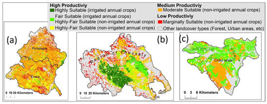 All the types of crops under investigation are combined, using a GIS-based multi-criteria analysis (MCA), to detect zones from most suitable to less suitable for each one. The final product is a crop-specific agroclimatic map divided into three productivity classes: (a) high productivity characterized by highly to fair suitable classes classification standards according to FAO classification standards, (b) medium productivity, corresponding to moderately suitable classes as defined by FAO, and (c) low productivity, comprising marginally suitable classes as defined by FAO.