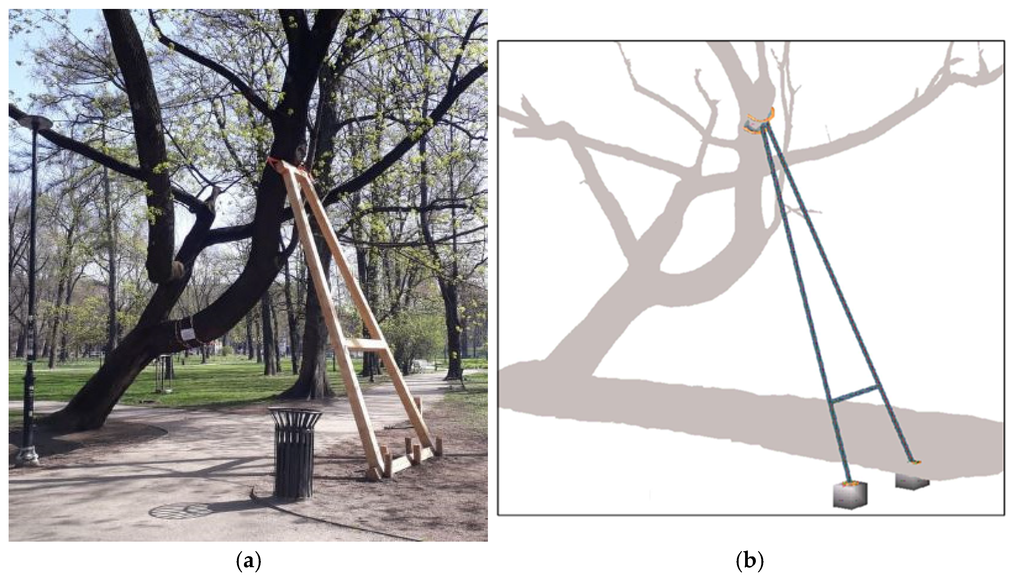 - Więckowski, Z.; Zwolski, A. Concept of additional supports to secure the “Bartek” oak and its branches and stiffenings of existing branch supports. J. Int. Soc. Cultiv. Prot. Trees 2011, 24, 107–113. [Google Scholar]