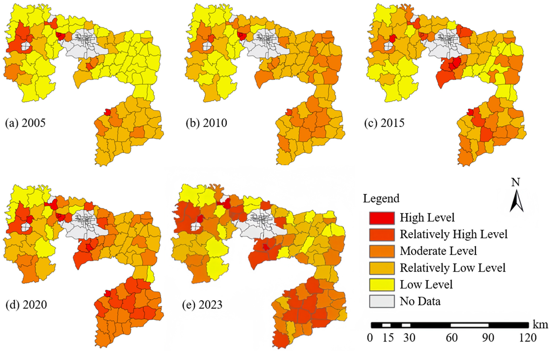 Figure 2). From the perspective of the overall pattern, high-level areas of LED exhibit two distinct clustering characteristics: a ring-shaped cluster centered on major urban built-up areas, and an industrial cluster concentrated in Huaxian County in the southeast. Medium-level areas are largely distributed around the high-level areas, demonstrating a clear spatial spillover effect. In contrast, low-level areas are mainly concentrated in the Taihang Mountains in the northwest and along the provincial border in the northeast, forming a continuous low-value belt.
