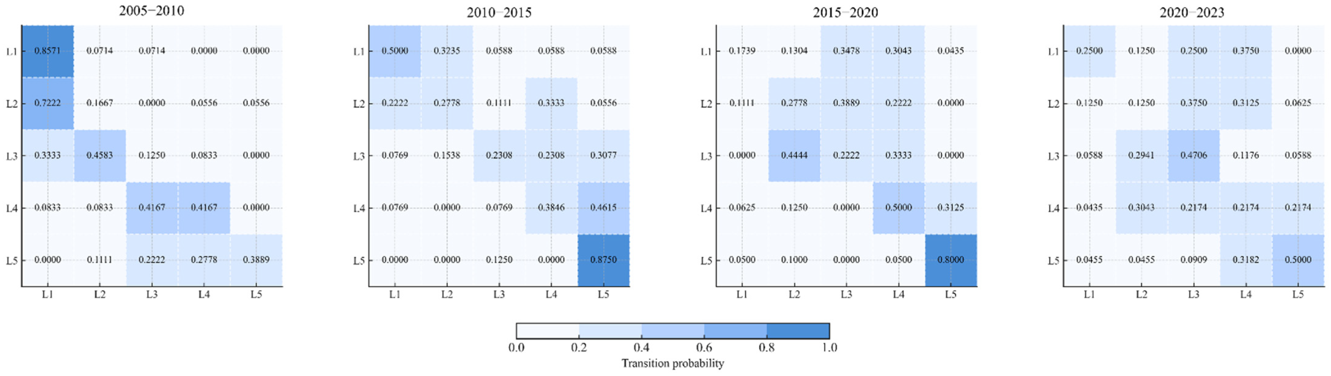 Figure 3). From 2010 to 2015, transitions became more pronounced, especially from Level 2 to Level 3, indicating upward mobility in LED development during the expansion stage. The period from 2015 to 2020 exhibits the most balanced structure, with significant probabilities of persistence but also notable transitions across adjacent levels, consistent with the quality enhancement phase. In the most recent period, 2020 to 2023, the transition matrix shows increased upward shifts from lower to higher levels, but also some reversals, particularly within intermediate categories, suggesting differentiation in development momentum across townships. Overall, the results highlight both the resilience of high-level areas and the mobility of middle-level areas, quantifying the spatial stability of LED evolution while revealing areas of potential vulnerability.
