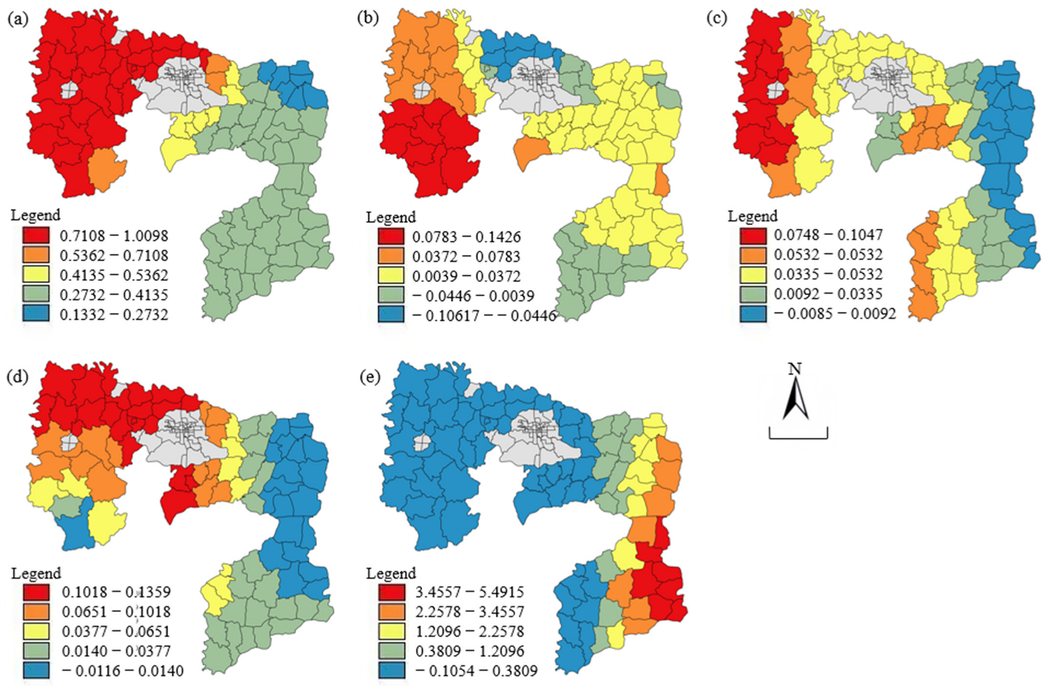 Table 5). This indicated that the GWR model was more effective in capturing the spatial heterogeneity of the data and demonstrated superior fitting performance. Based on this comparison, the GWR model was subsequently applied to further explore the spatial heterogeneity of influencing factors, with the spatial distribution patterns and local variations of the regression coefficients (