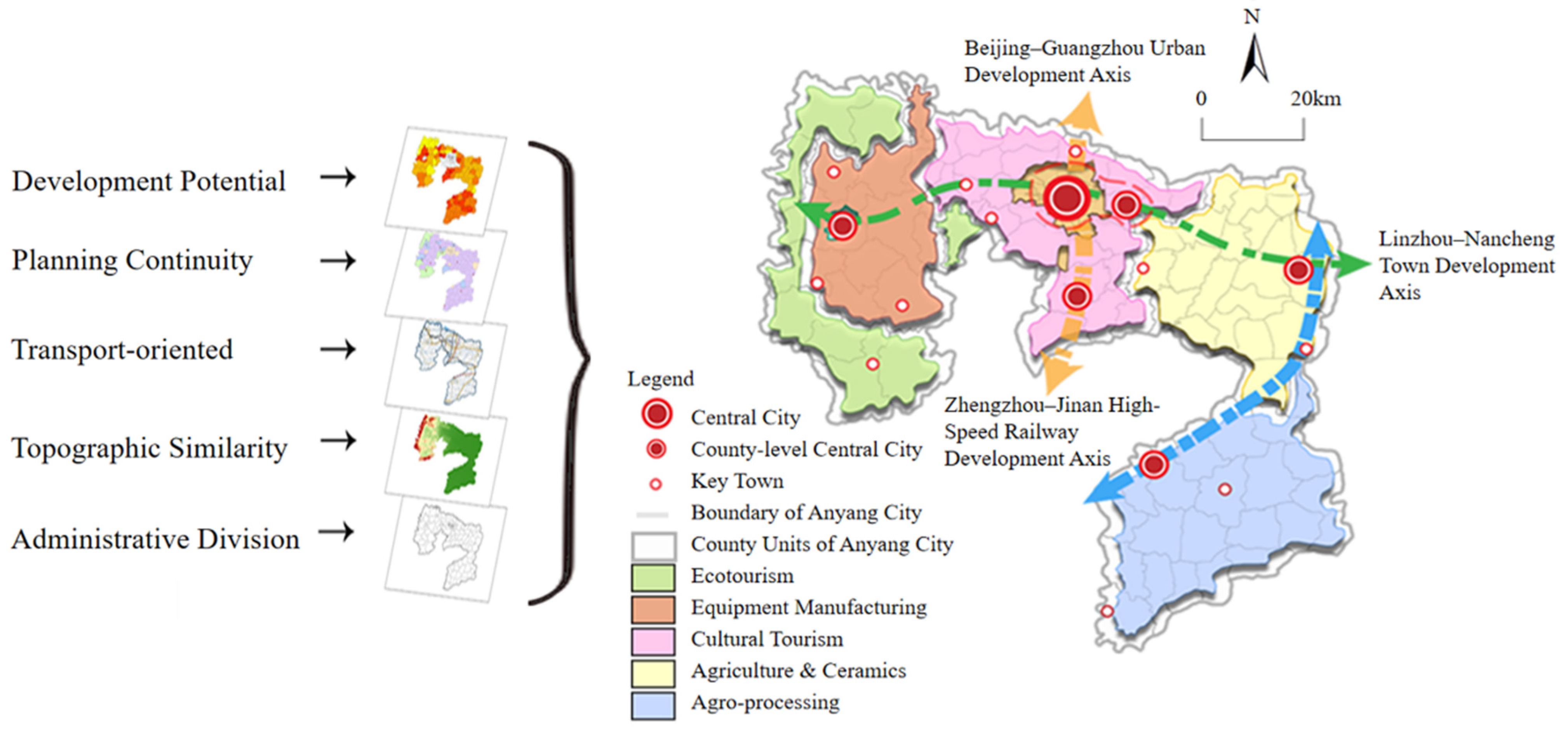 Finally, with administrative boundaries defining implementation edges, five zones were formed: (1) an Environmental Protection and Eco-tourism Zone, (2) a High-end Equipment Manufacturing Industrial Cluster, (3) a Peri-urban Industry and Cultural–Historical Tourism Zone, (4) a Specialized Agriculture and Green Ceramics Production Zone, and (5) an Agro-product Deep Processing Zone (