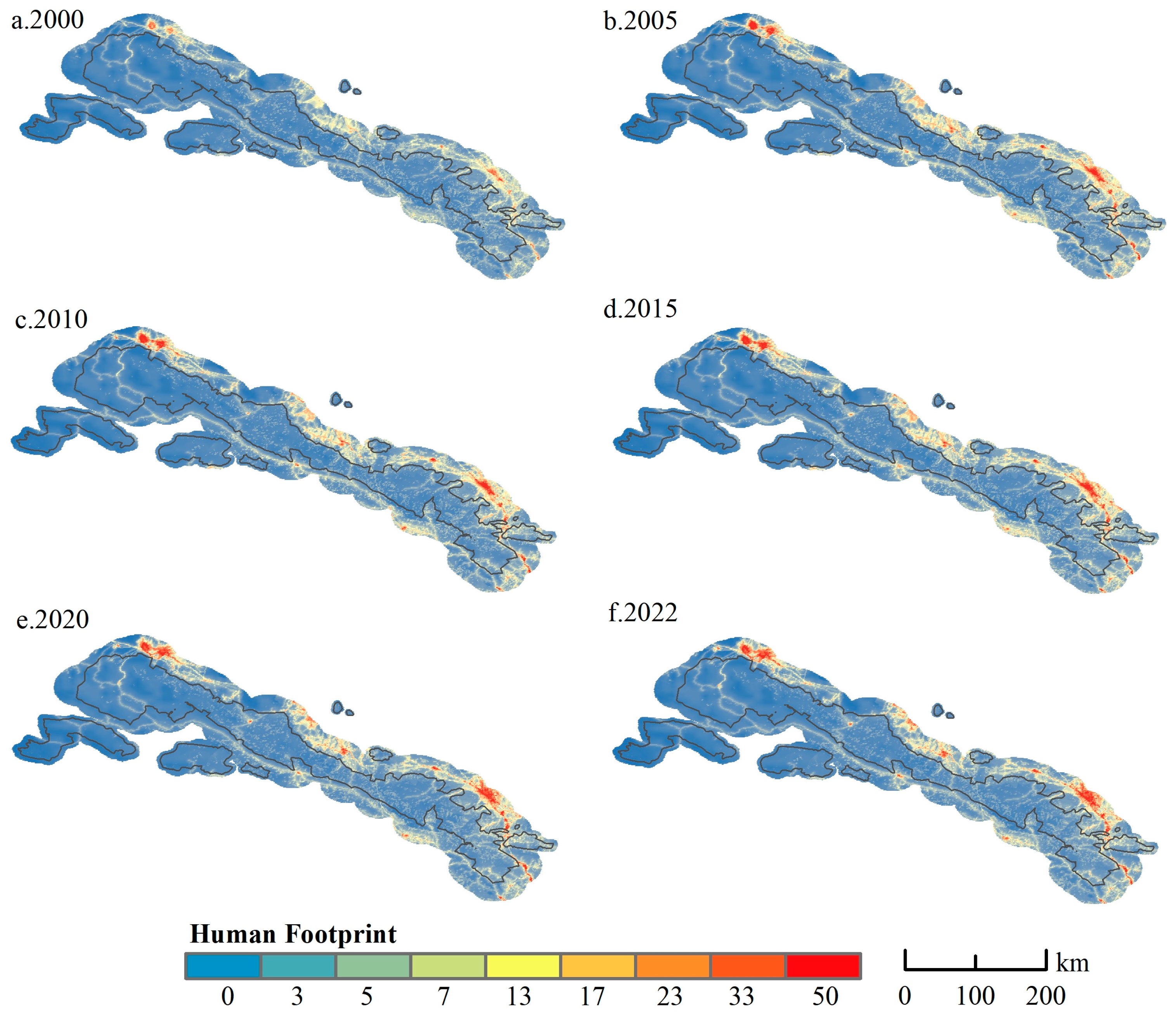 | Built environments | 0, 4, 10 | The pressure score for pixels with urban fractions above 20% was assigned as 10; otherwise, it was assigned as 4. | 2000–2022 |
