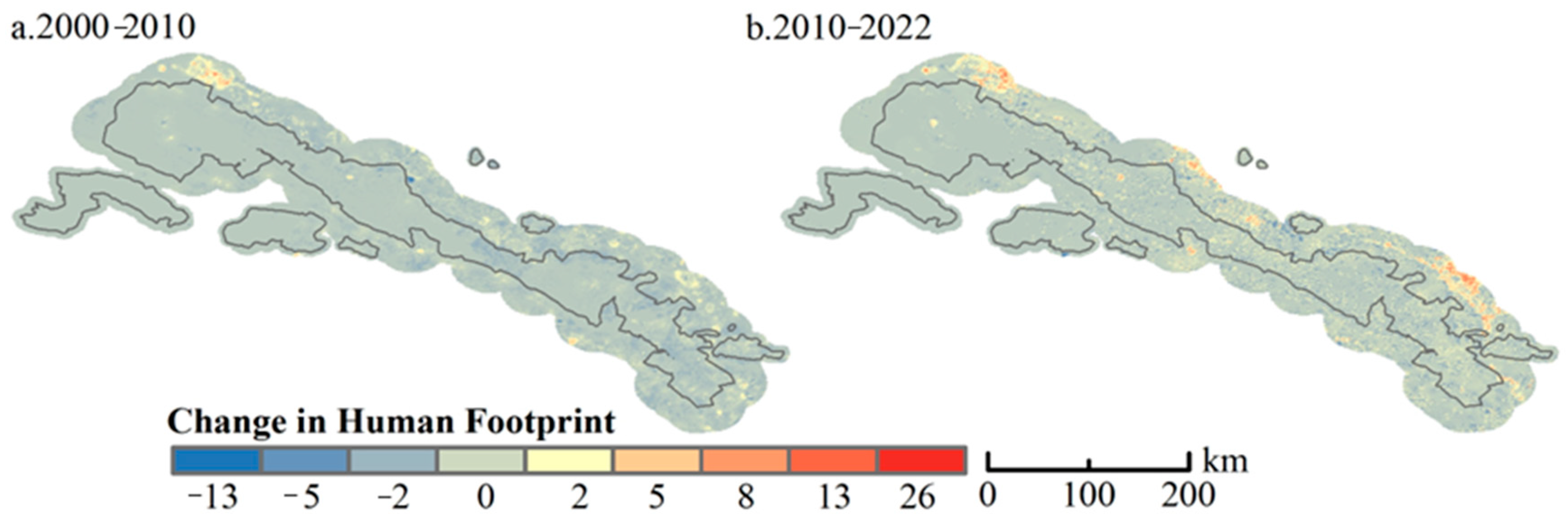- Li, S.; Wu, J.; Gong, J.; Li, S. Human footprint in Tibet: Assessing the spatial layout and effectiveness of nature reserves. Sci. Total Environ. 2018, 621, 18–29. [Google Scholar] [CrossRef]
