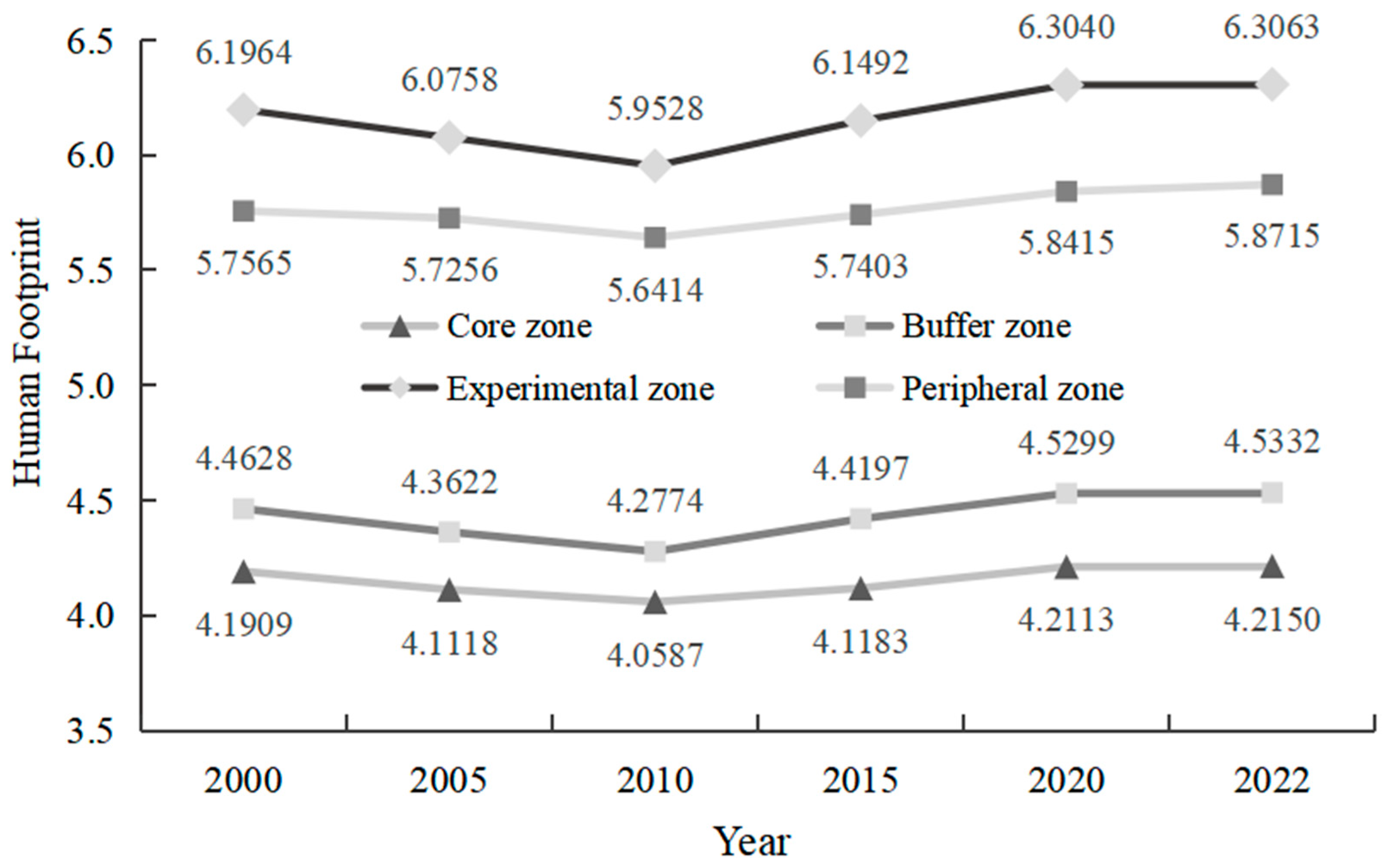 4.2. Assessment of Human Footprint Variability Across Functional Zones of the QMNNR
