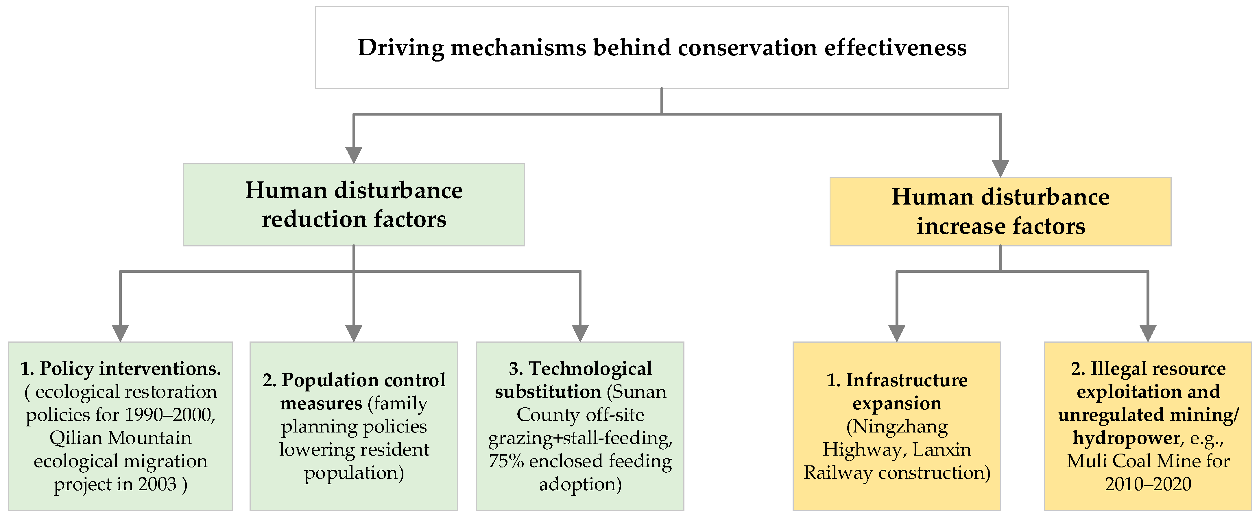 5.2. Driving Mechanisms Behind Conservation Effectiveness